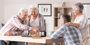 Elderly people playing chess in nursing home